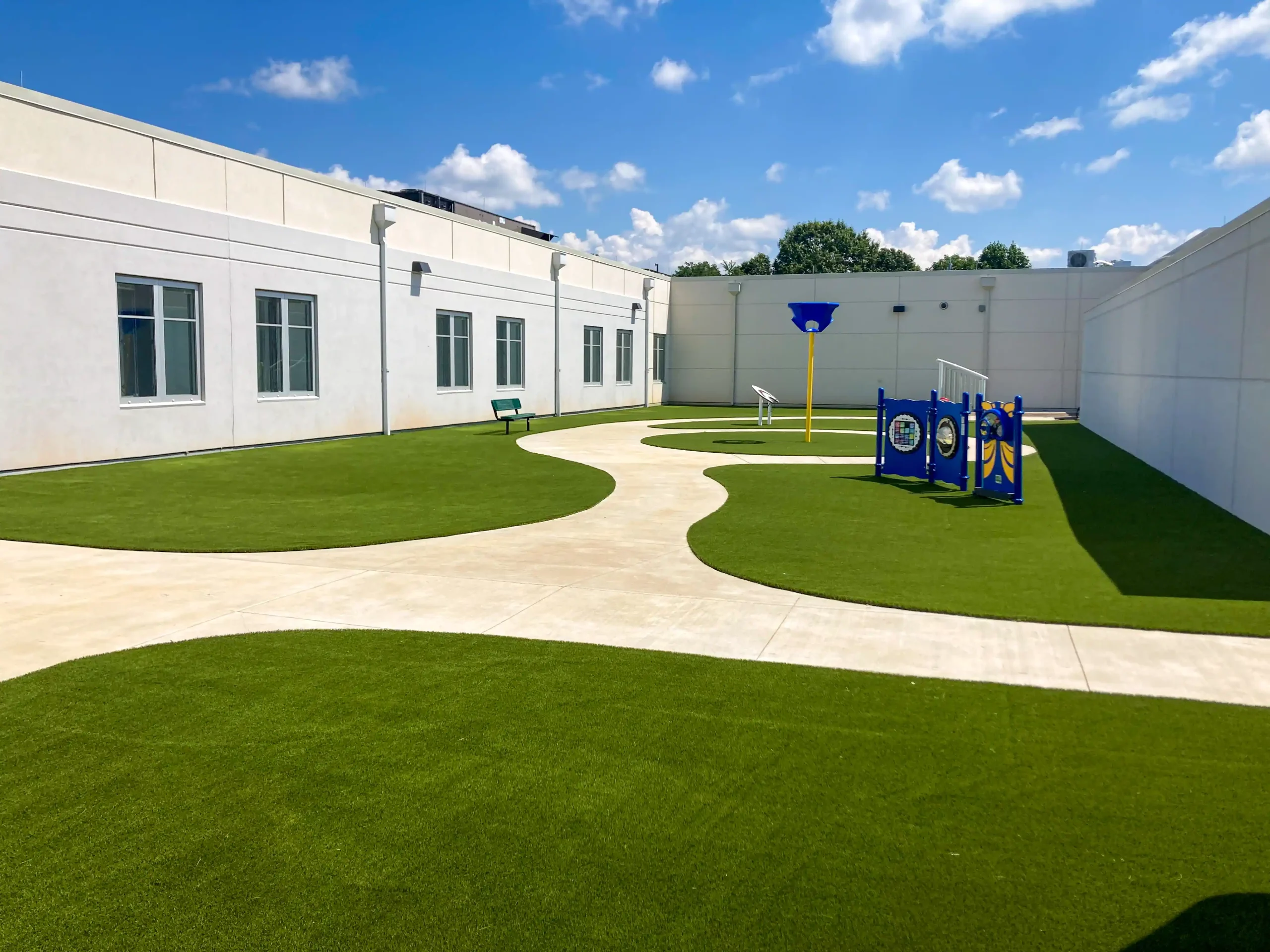 The Sweeten Creek Mental Health and Wellness Center at Mission Behavioral Health Hospital is a mental health treatment facility with both in-patient and outpatient services. This particular courtyard is for their 120 teenage patients who will go through treatment while staying at the center. This project was unique as we had to alter our installation method several times after concerns that they patients could find our installation materials (such as screws, stone, and the nailer boards) and harm themselves or others. Taking this in consideration, SYNLawn Carolina helped the developers and hospital staff come up with a solution. Concrete was poured in place of an aggregate base .5” below FFG, drains were added, and the artificial grass was glued directly to the concrete.